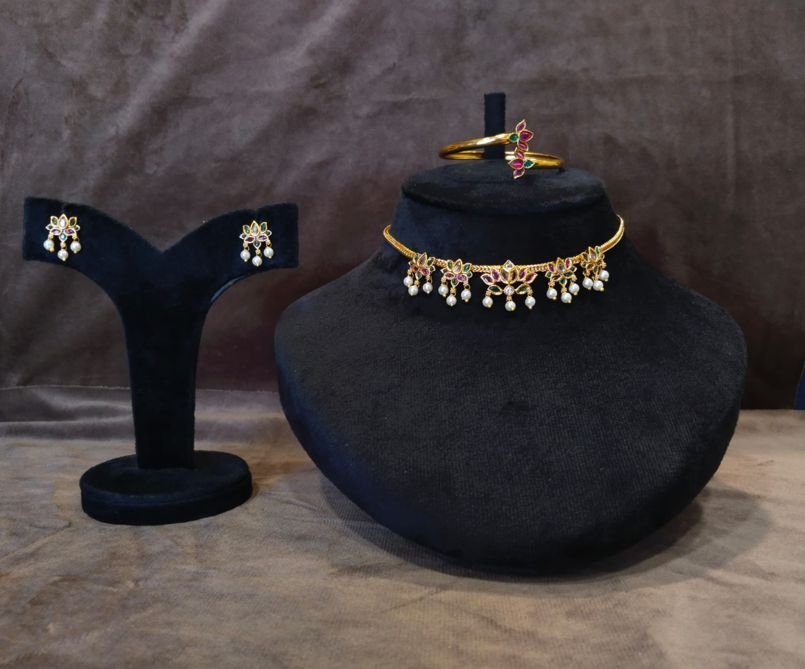 The short necklace sits gracefully on the neckline, highlighting the intricate lotus centerpiece, while the coordinated bracelet adds a touch of sophistication to your wrist. Perfect for festive occasions, weddings, and special celebrations, this set blends tradition with contemporary finesse.